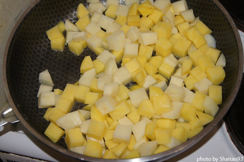 Этап 1. Картошка чиститься, нарезается кубиками (ну или любыми другими геометрическими формами), и доводиться о состояния полуготовности на сковородке