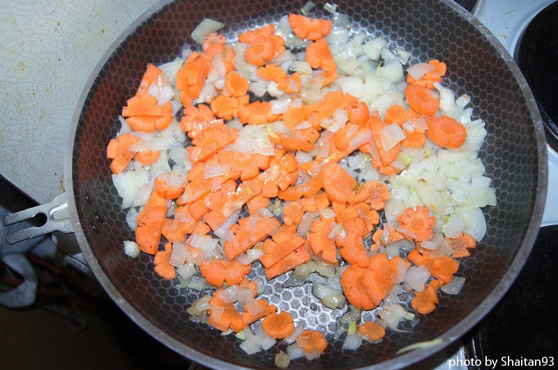 Этапы 2 и 3. До того же состояния полуготовности необходимо довести лук, морковь и мясо