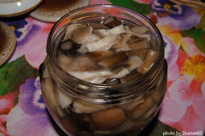 Стадия три — грибы. Тут кому как… кто-то любит поменьше, кто-то побольше. У нас вышло по две столовые ложки. Сразу скажу, что маринованные грибы в составе блюда довольно оригинальное решение (пробовали первый раз — понравилось)