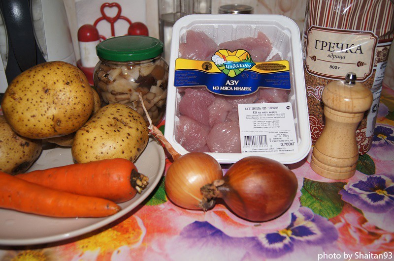 Для начала подготавливаем все ингредиенты: картошка, лук, морковь, мясо (в данном случае использовалось мясо индейки), грибы (на сей раз решено было поэкспериментировать с маринованными, а не с заморозкой), гречка, сыр, чеснок, соль, приправы по вкусу, масло растительное для жарки.