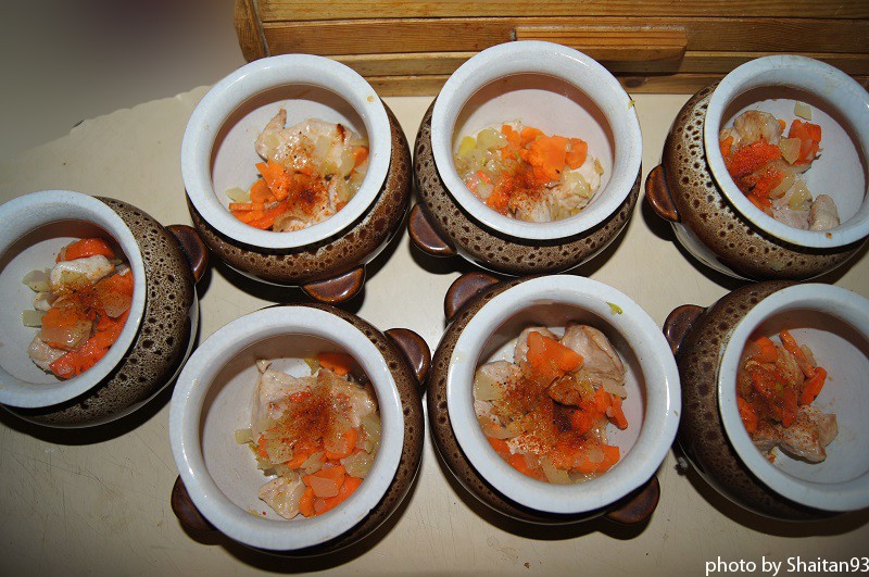 Этап 4 — формирование блюда. Стадия первая — в горшочек закладывается мясо, затем лук с морковью, + добавляются специи по вкусу ( у нас были красный жгучий перец и хмели-сунели)