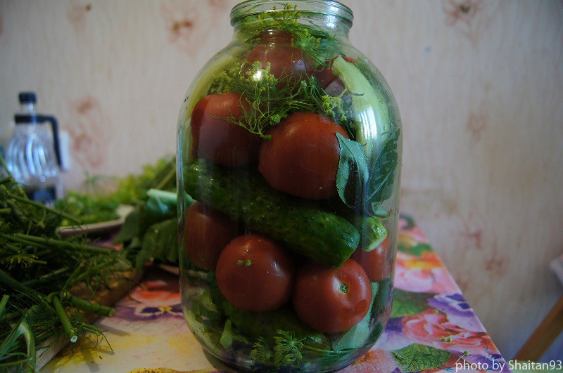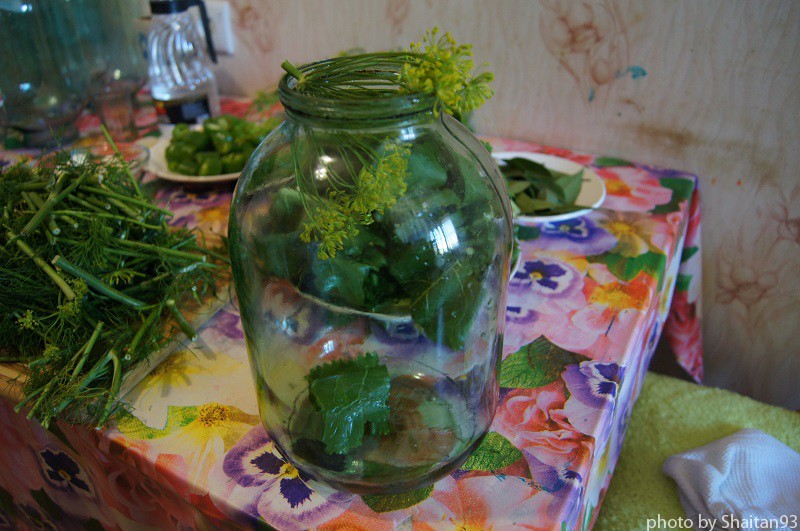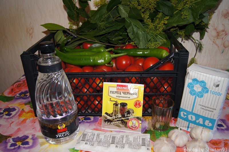 Огурцы, помидоры, пара «веников» для засолки (хрен, укроп, вишня, лаврушка, лист смородины), соль, уксус, перец — «горошек», аспирин.