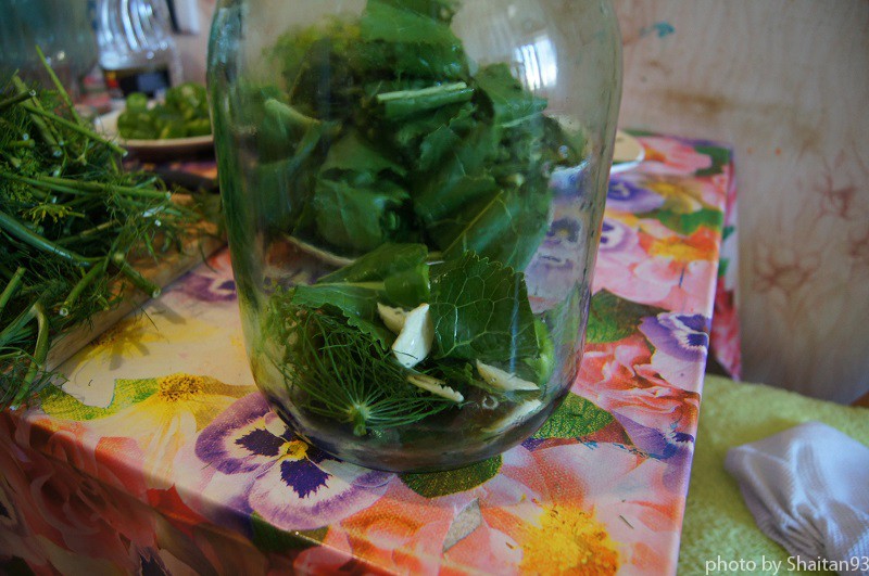Овощи необходимо помыть, «жопки» огурцам поотрезать, острый перец нарезать, «веник» нашинковать крупными кусками, чеснок почистить… Короче все подготовить. У меня получилось примерно так.