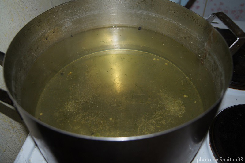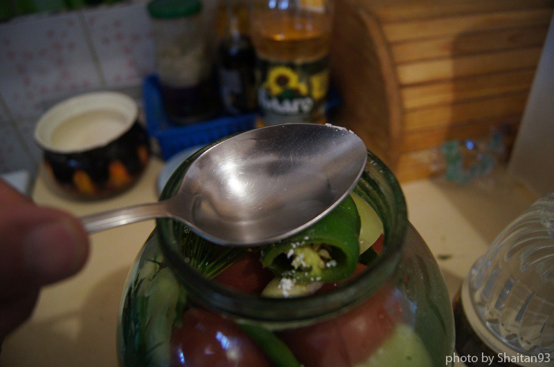 3. Далее процесс у разных людей может разниться. Я заливаю овощное ассорти кипятком, даю постоять минут десять, потом воду сливаю. После этого готовлю рассол. Пропорция — на полтора литра воды примерно полторы ложки соли и ложка сахара. Количество соли может варьироваться в зависимости от пристрастий ваших вкусовых рецепторов языка и состояния здоровья печени ))) Потом уже готовый рассол снова довожу до кипения и разливаю в неуспевший остыть баллон.