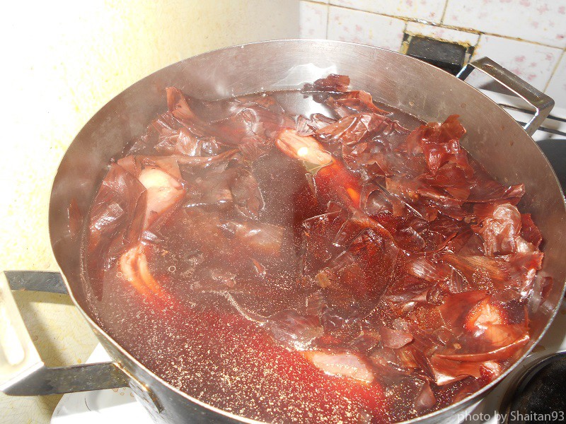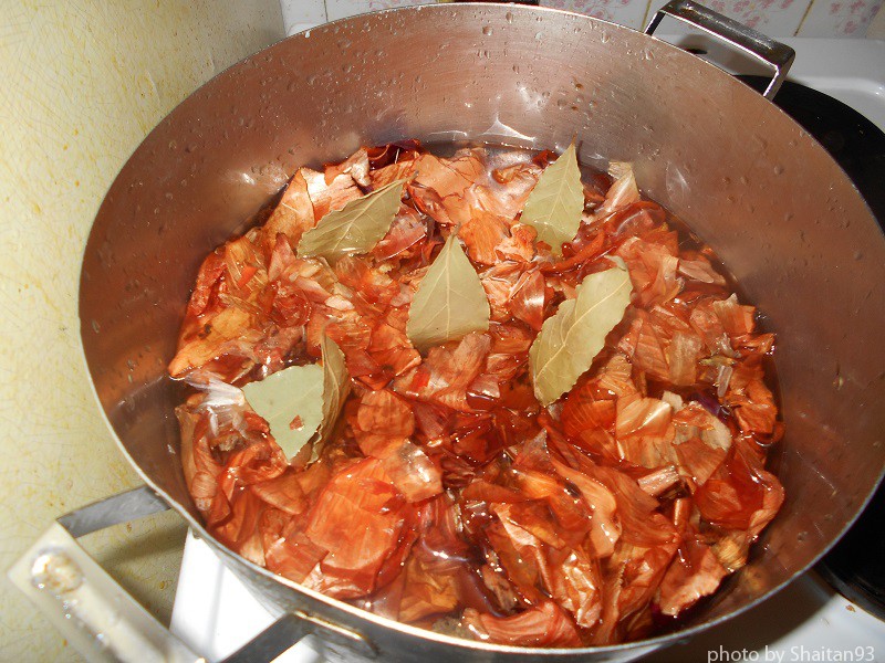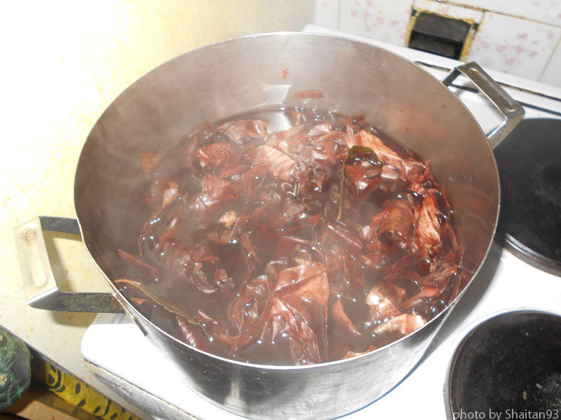 Туда же отправились три столовых ложки (с горкой) соли крупного помола. Кастрюлю водворил на огонь и после закипания воды дал шелухе провариться минут двадцать, дабы вытянуть из неё весь цвет.
