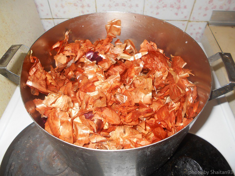 Теперь приступил к приготовлению «шоколада». Для этого взял кастрюлю, в которую смогут поместиться оба куска, и наполнил её луковой шелухой. Понадобилось этого продукта полный прозрачный полиэтиленовый пакет (ну те, которые в магазинах бесплатно)