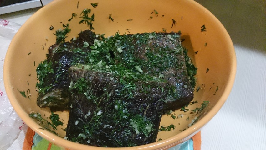 С мяском далее поступил так: проварил пол часика с лаврушкой и перцем, натер давленным чесноком и измельченным укропом. Вообще деликатес незапланированный вышел )