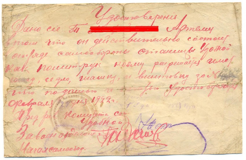 Дано сиё т. ____________ Артёму в том что он действительно состоит в отряде самообороны станицы Удобной как политрук коему разрешается иметь лошадь, седло, шашку и винтовку за № ***********, что подписью и печатью удостоверяется февраля 29 дня 1922 г.