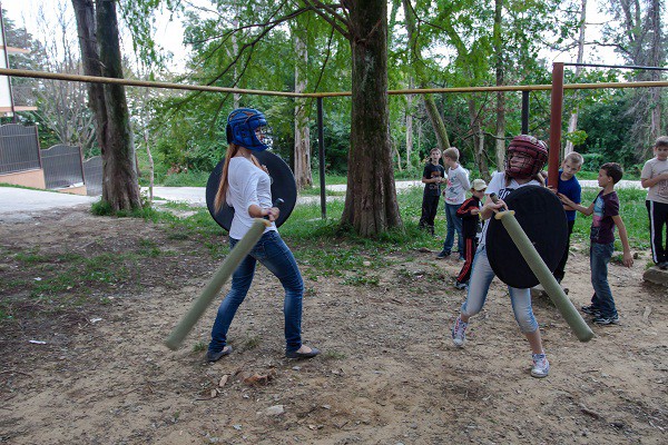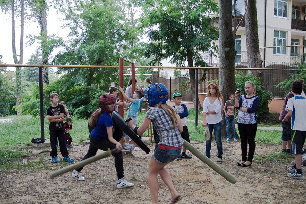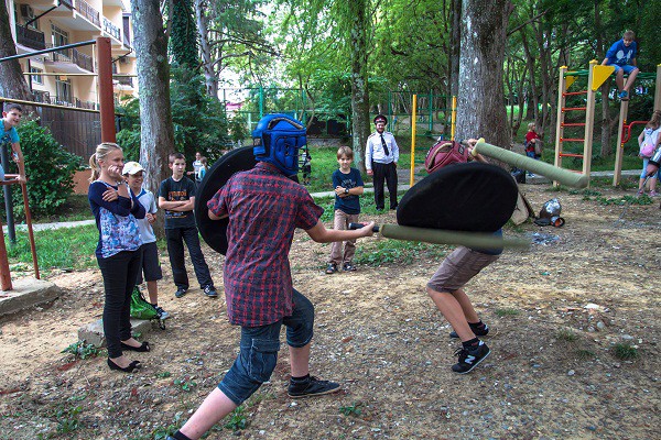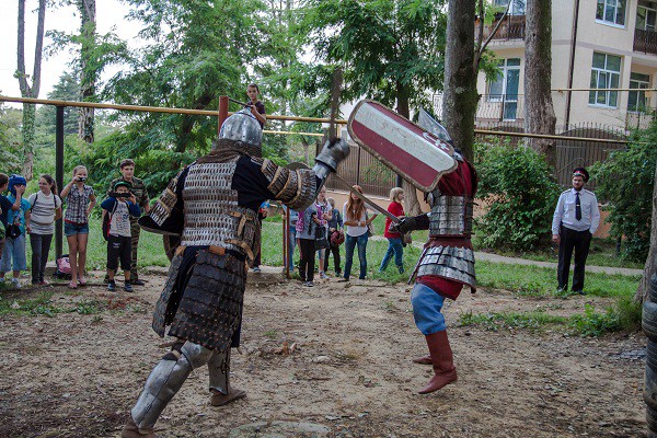 После началась вторая часть экскурсии, все вышли на тренировочную площадку. Где увидели бой между русским витязем и воином Золотой Орды.
