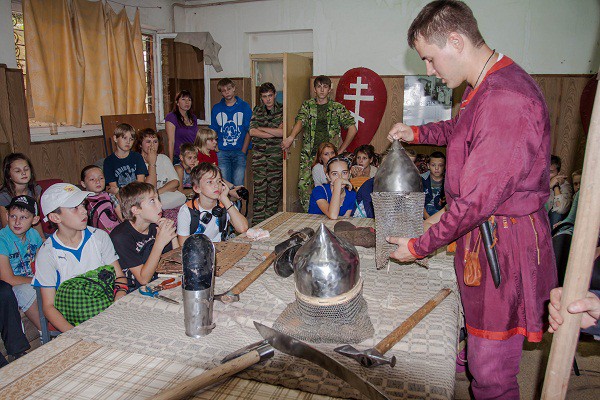 Детвора быстро заполнила помещение и реконструкторы начали наглядный урок истории Древней Руси.