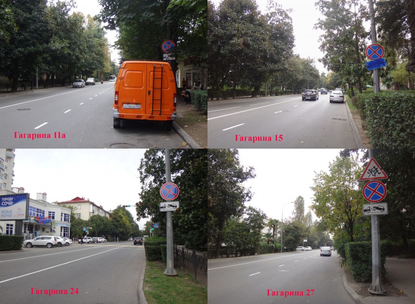 Знаки 3.27 совместно с 8.24 по ул. Гагарина от ДКП в сторону ул. Московской у домов №№49, 27, 15/4, 11а; и от ул. Московской в сторону ДКП у домов №№24, 48 — участки с двумя полосами движения в данном направлении. Парковка справа вдоль проезжей части не создает существенных помех для движения. Следует демонтировать знаки 3.27 или хотя бы заменить их на 3.28, 3.29 или 3.30, а также демонтировать знаки дополнительной информации 8.24.