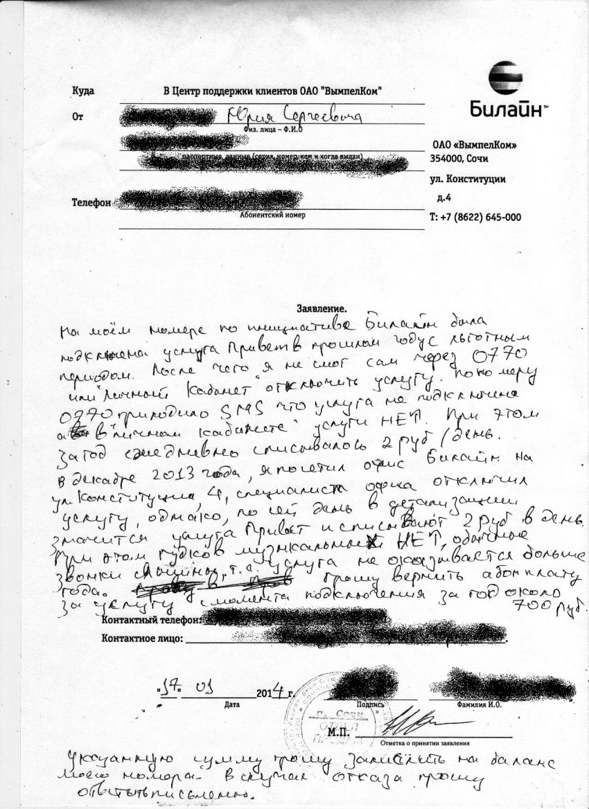 Каракули моиНа моём номере по инициативе Билайн была подключена услуга «Привет» в прошлом году с льготным периодом. После чего я не смог сам через номер 0770 или «Личный кабинет» отключить услугу. По номеру 0770 приходило СМС, что услуга не подключена, а в «Личном кабинете» услуги нет. При этом за год ежедневно списывалось 2 руб. в день.