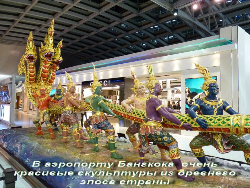 На другой день подъём в 3 утра, а в 4 за нами и заехал минибас и отвёз нас в аэропорт Бангкока. Огромный, украшенный живыми орхидеями и статуями из храмов, он скорее похож на экзотический музей, по которому можно бродить много часов, открыв рот. Изо всех сил работает кондиционер, поэтому довольно прохладно. Можно воспользоваться интернетом или позвонить на родину, Несколько приличных кафе и богатый дьюти фри. Один из лучших аэропортов в мире. Нас приглашают на посадку и мы летим в столицу Бирмы, или, как её сейчас называют Мьянмы, город Янгон (Рангун).