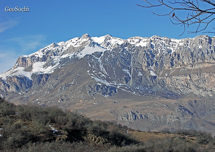 С башни открывается прекрасный вид. Слева четырехтысячный пик Геодезистов, а справа увенчанная ледяной шапкой громада Шаухох 4636м. Шаухох — по-русски Чёрная гора, третья по высоте вершина Осетии.