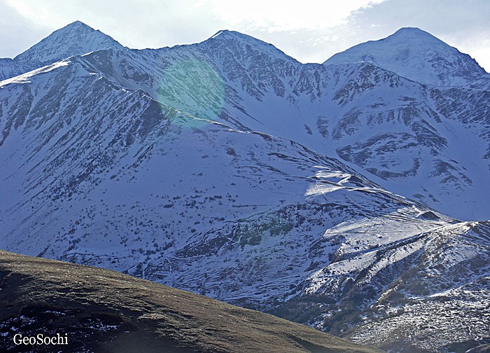 В глубине ущелья просматривается величественный километровый по высоте ледопад ледника Майли. Огромный ледяной поток стекает с Казбегского фирнового плато. Это второй по величине ледопад Кавказа. У самого языка ледника на склоне выходы горячих (53 град) нарзанов, для купания в которых на склоне цепочкой выложены ванны из камней. В своё время мы с друзьями очень любили устраивать там базовый лагерь для зимних восхождений в районе. Несмотря на холод и близость ледника в нарзане всегда можно было отогреться, сготовить ужин и просто посидеть перед сном в холодной палатке. Но мы отвлеклись.