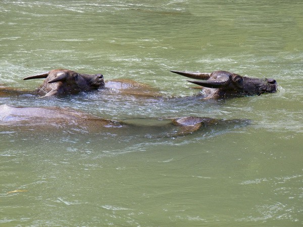 Рядом принимали водные процедуры буйволы. Так животные спасаются от жары.