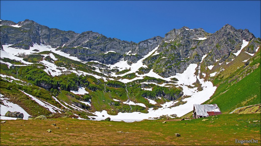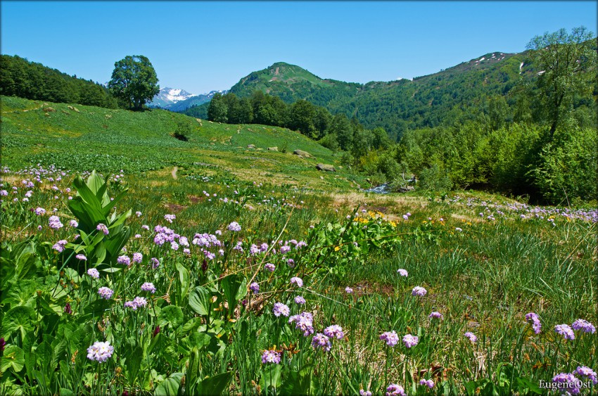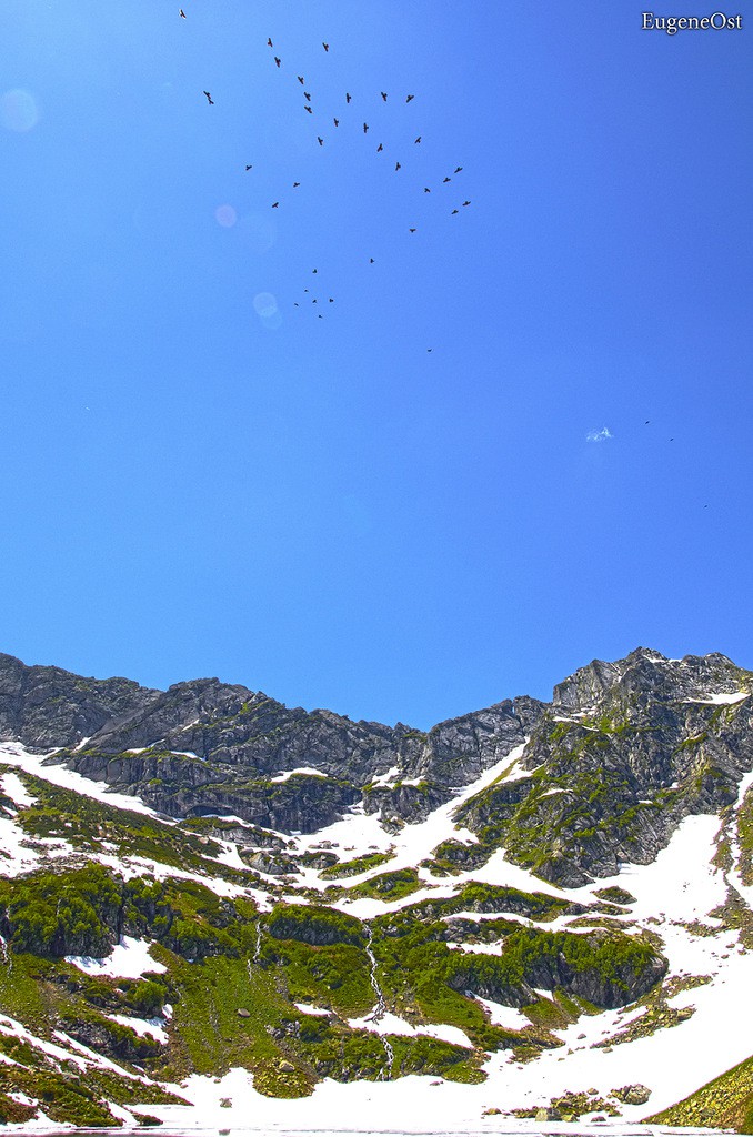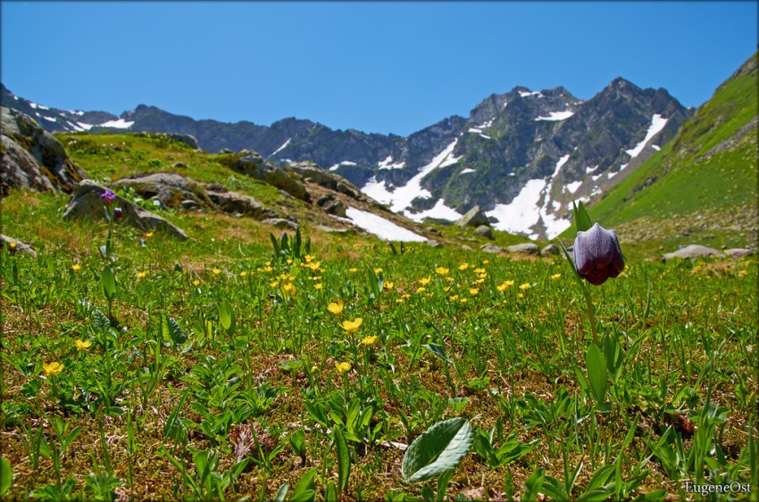 На горных першинах ещё лоскутами лежит снег, а луга тонут в зелени и цветах. А нас самих не плохо в тот день пожарило яркое горное солнце