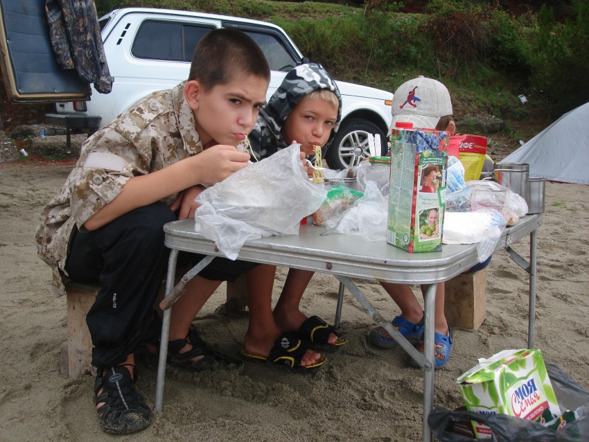 Ночевать решили на море, т.к. лес после ливня был пропитан водой, со всех деревьев капало, земля как губка. Приехали в Пицунду уже к полуночи, поставили палатки, искупались в тёплом море, только все улеглись, как с моря пришла гроза с ураганным ветром и тропическим ливнем, просидели всю ночь, держа улетающую палатку руками(в песке её крепить особо не к чему было!). Впоследствии выяснили, что в Сочи в эти дни не упало ни капли! Прогнали непогоду в Абхазию? Второе наше утро после бессонной ночи, завтрак на песке.