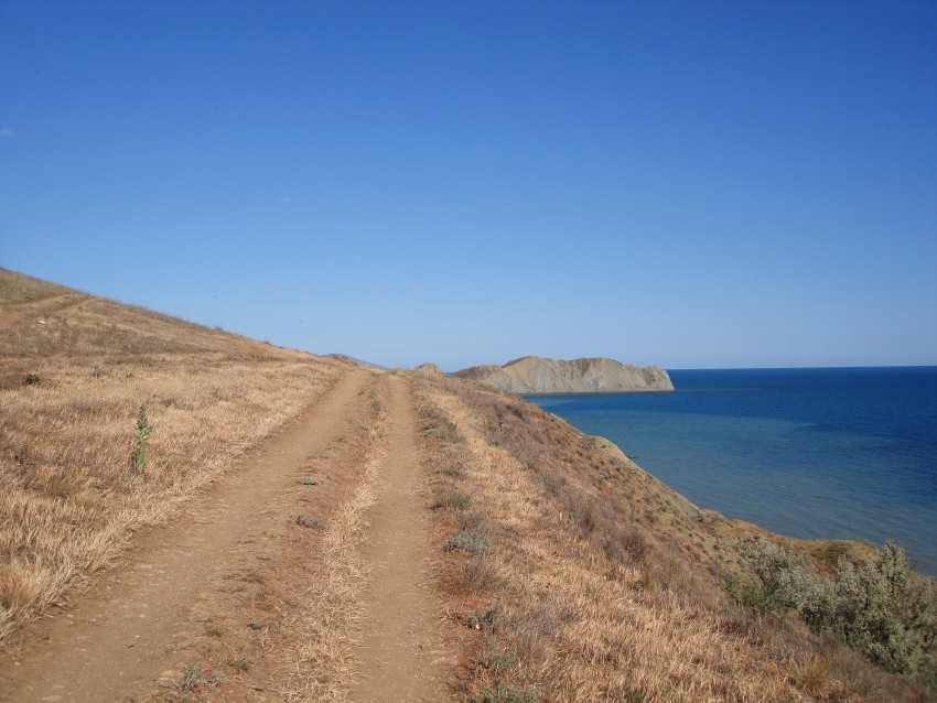 Раньше на оконечность мыса шла грунтовая дорога, но теперь осталась лишь узенькая тропа — море размывает мыс.