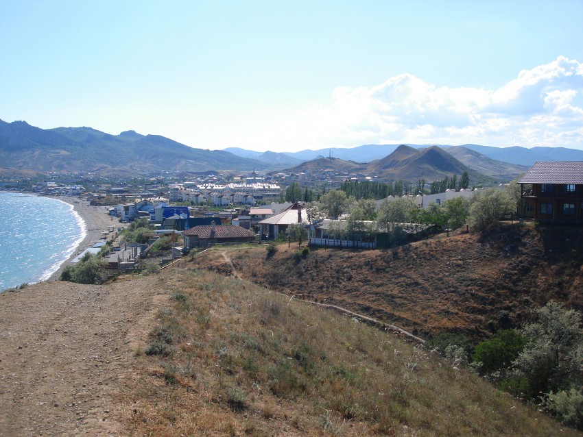 Вид с дороги на Коктебель. Бухта, открытая ветрам, рай для парапланеристов. Михаил Булгаков так писал о Коктебеле:«Сюда нельзя ездить людям с очень расстроенной нервной системой. Я разъясняю Коктебель: ветер в нем дует круглый год ежедневно, не бывает без ветра ничего, даже в жару. И ветер раздражает неврастеников.»