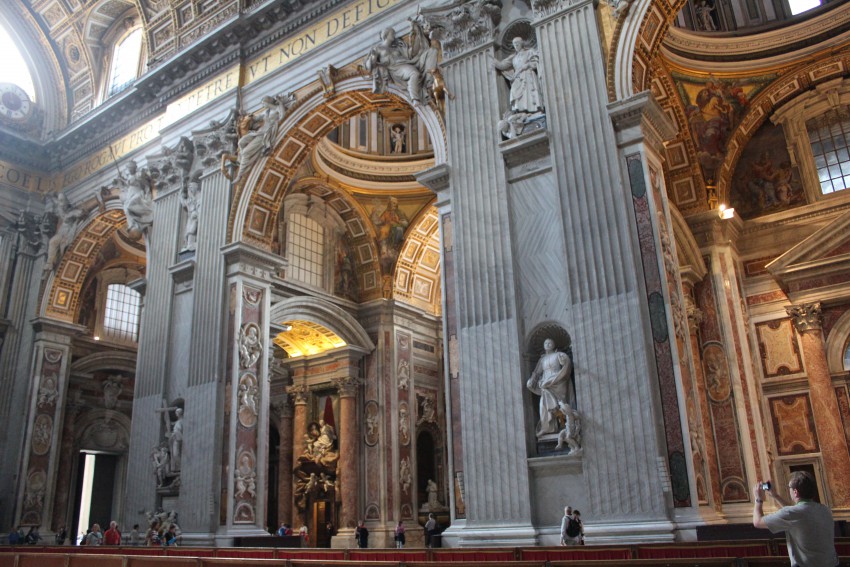 Естественно нельзя было не зайти в знаменитый собор Святого Петра, который у католиков всего мира вызывает трепет при одном его только упоминании. В храме покоится прах самого апостола Петра. Его останки, мощи других святых и Римских пап покоятся в нижних помещениях храма, и спускаться туда не разрешено. Убранство храма, конечно же, очень богато, видимо для того чтобы подтвердить свою значимость в мировых масштабах