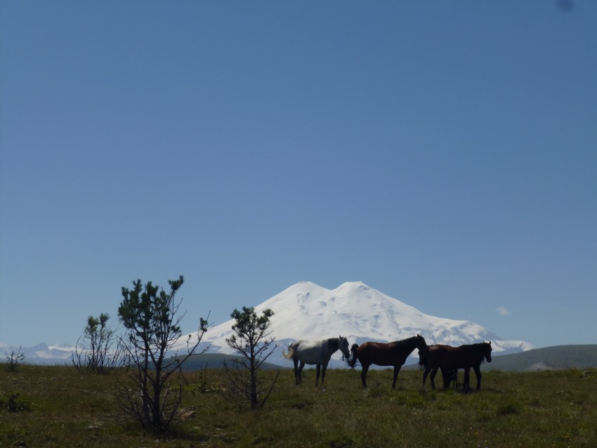 Дальше дорога то поднимается на хребты, то уходит в ущелья, и, конечно, попадаются «свои» лошади на фоне Эльбруса