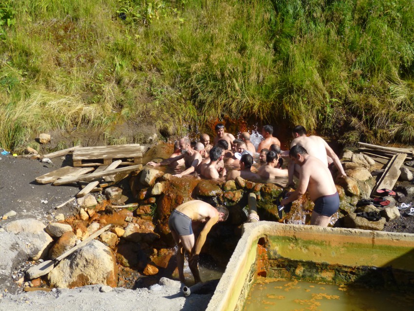 В долине реки Малка в нарзанных источниках купание. Оказывается, тут определено когда купаются мужчины, когда женщины, когда из минибассейна сбрасывается вода и люди принимают ванны в сухой углекислоте.