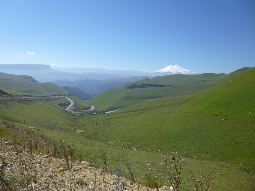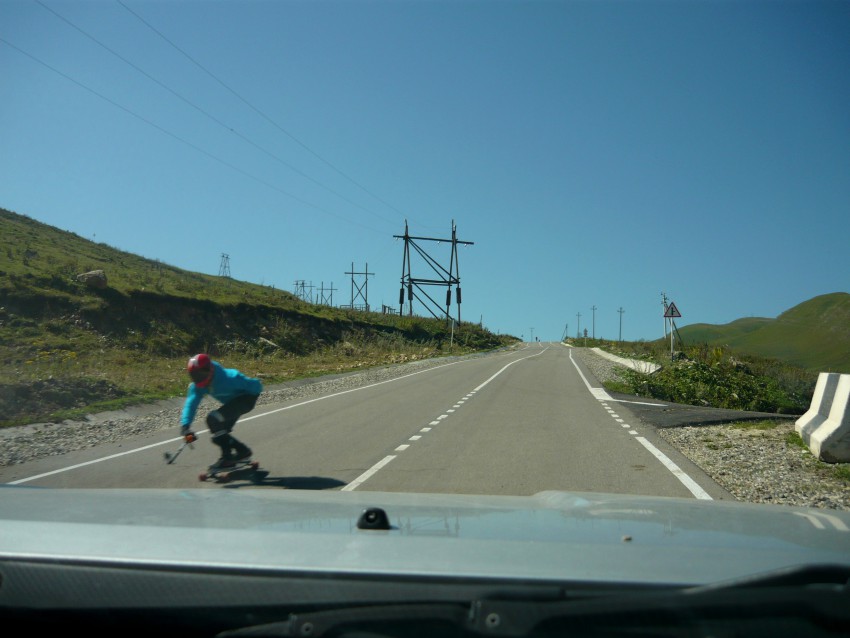 Не считая кусочка плохой дороги на выезде из Кисловодска остальная часть дороги новая, с хорошим покрытием, правда, очень извилистая. Вдали показывается Эльбрус. А нам навстречу несутся скейтбродисты — для них тут раздолье, покатые ровные склоны, новый асфальт.