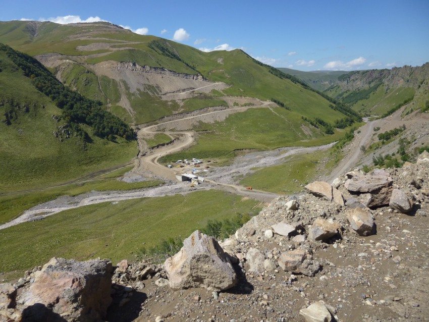 Последний кусок дороги в ущелье Джилы-Су грунтовка далеко не лучшего качества, идут строительные работы. Возить материалы, технику, асфальт сюда очень далеко и поражаемся размаху работ и пытаемся предугадать будущее этих мест.