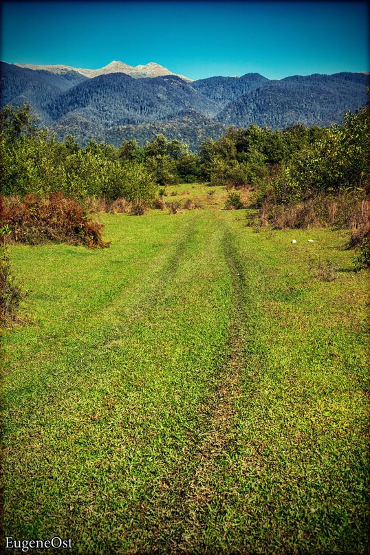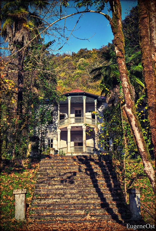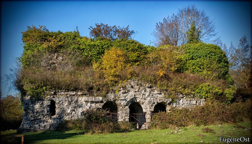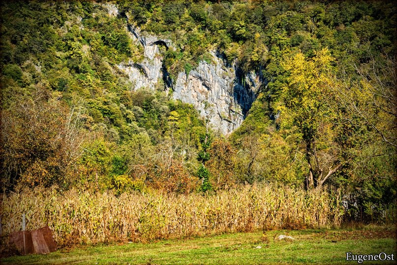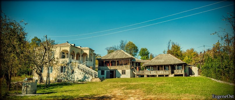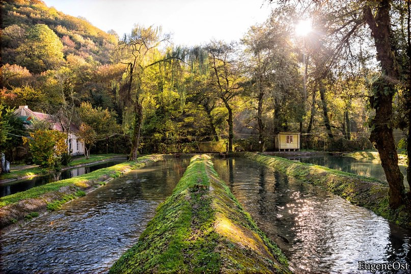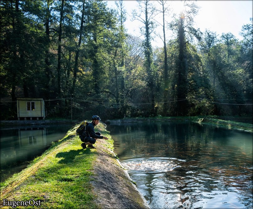 помчали в сторону Гудауты, миновав Мысринский пост, мы свернули в сторону гор к Форелевому хозяйству в селе Жабна, на территории которого находится очень интересный объект, но об этом под катом.