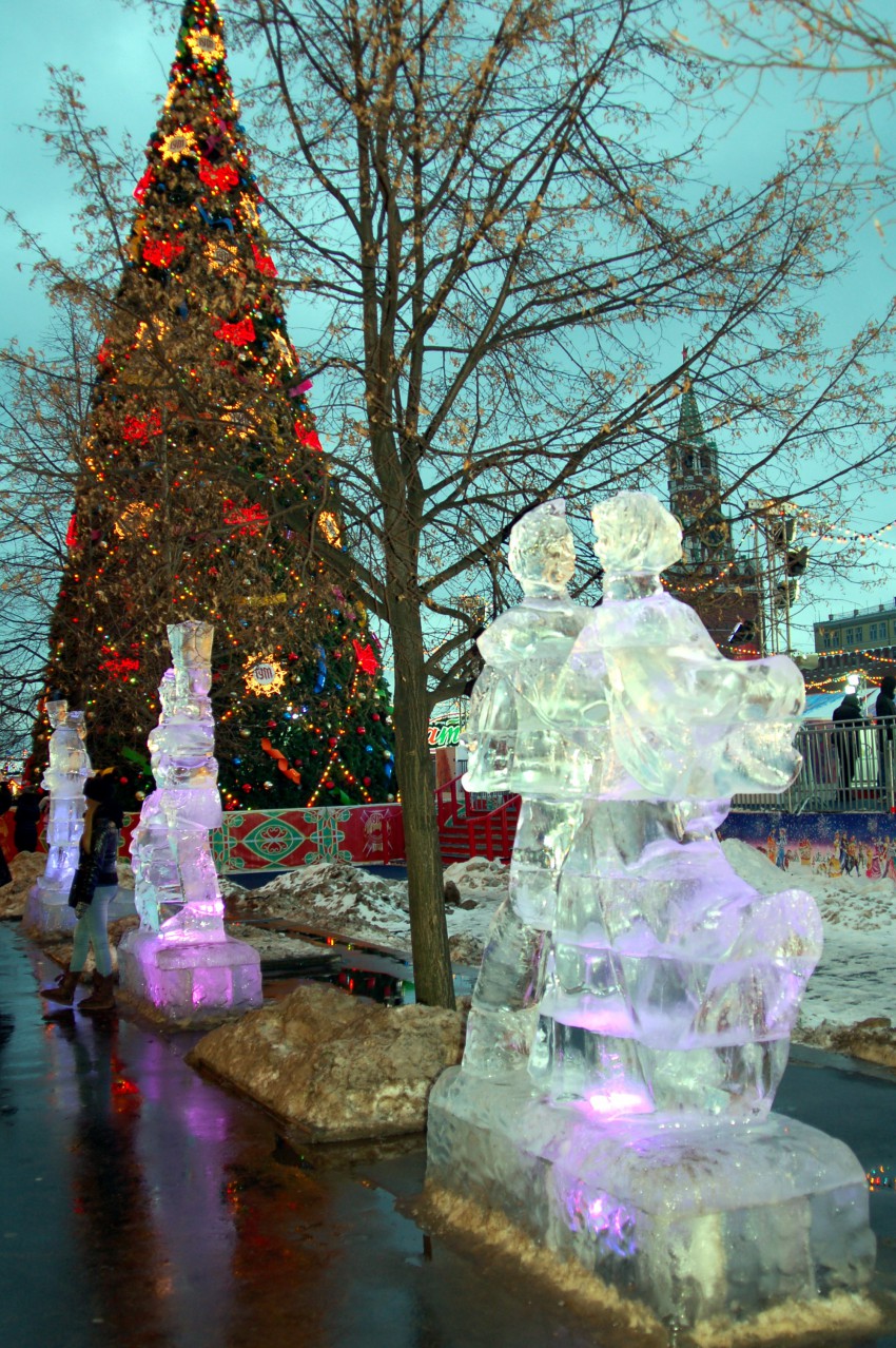 Площадь украшена ледяными фигурами.