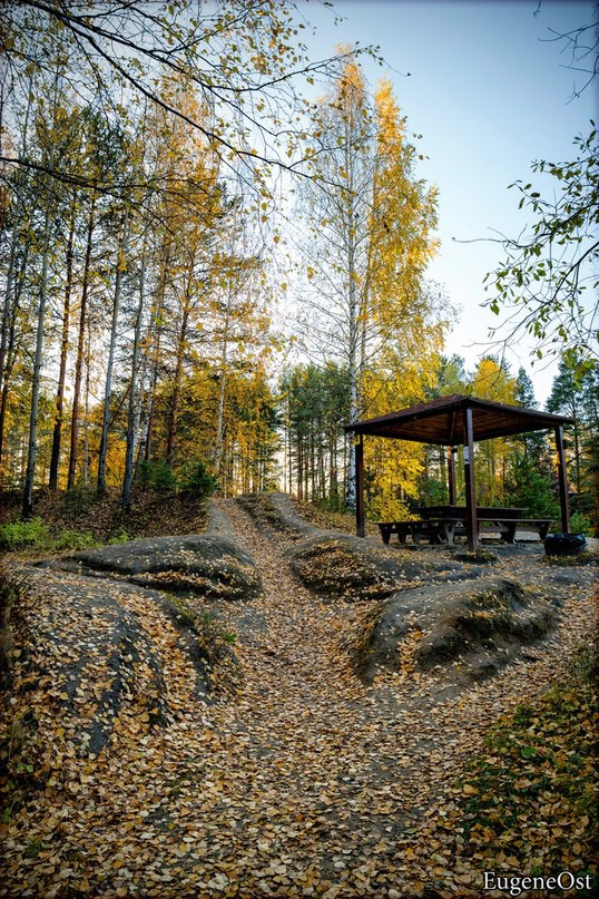 Около часа езды по шумному городу с западной окраины на восточную и мы в тихом осеннем лесу. По пути останавливаемся на Калиновском роднике. Берёзки расстаются с листьями, родники под крышами, укрывающими от попадания лишнего мусора, и можно отдохнуть на таких вот лавках…