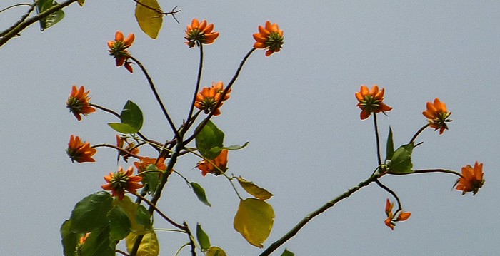 Среди ветвей выделяются крупные цветки кораллового дерева.