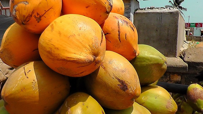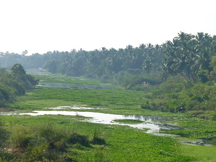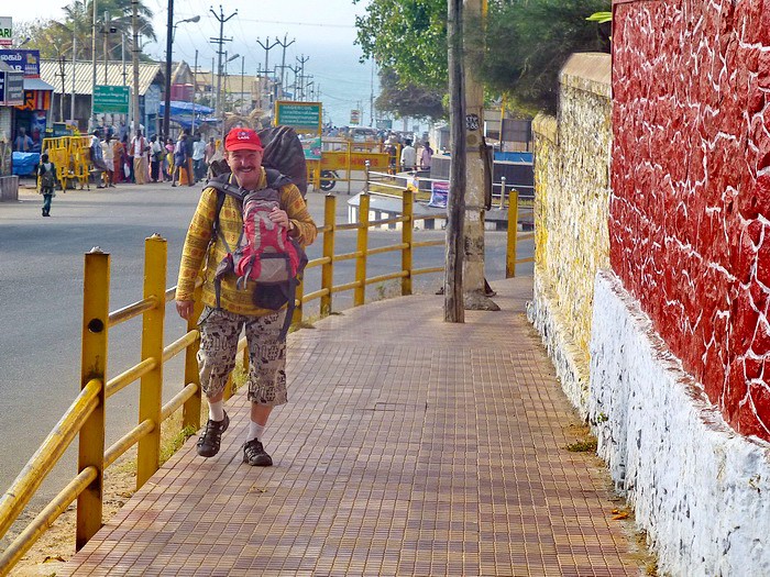 Утром садимся в автобус и едем на юг – в Каньякумари. Автобус комфортабельный: широкий проход, удобные кресла. И есть одна особенность: над проходом висит верёвочка, с помощью которой кондуктор сигналит водителю об остановках. Здорово придумано – не нужно кричать. Сначала ехать было прохладно – дул сильный ветер в окна. Пришлось даже одеть рубашку. Вдоль дороги мелькали ветхие жилища аборигенов и рощи кокосов.
