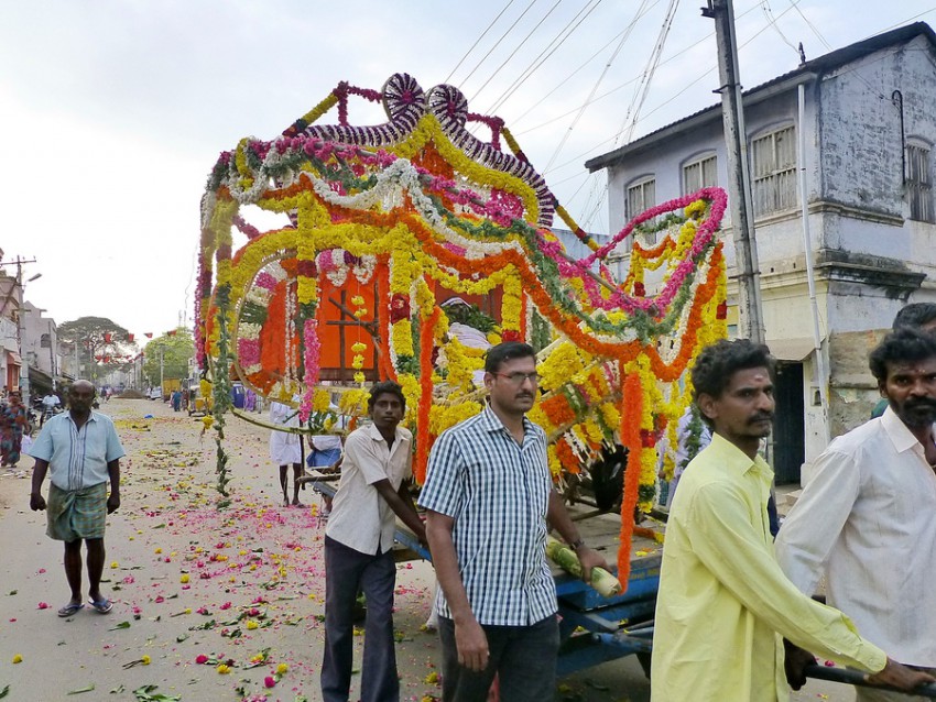 Именно в Качипураме мы были свидетелями, как индуисты провожают в последний путь своих умерших родственников. Они не печалятся и не плачут, а скорее радуются, что человек ушёл в другой мир. Все индуисты верят в перевоплощение. Вот в такой разукрашенной карете провожают они покойного.