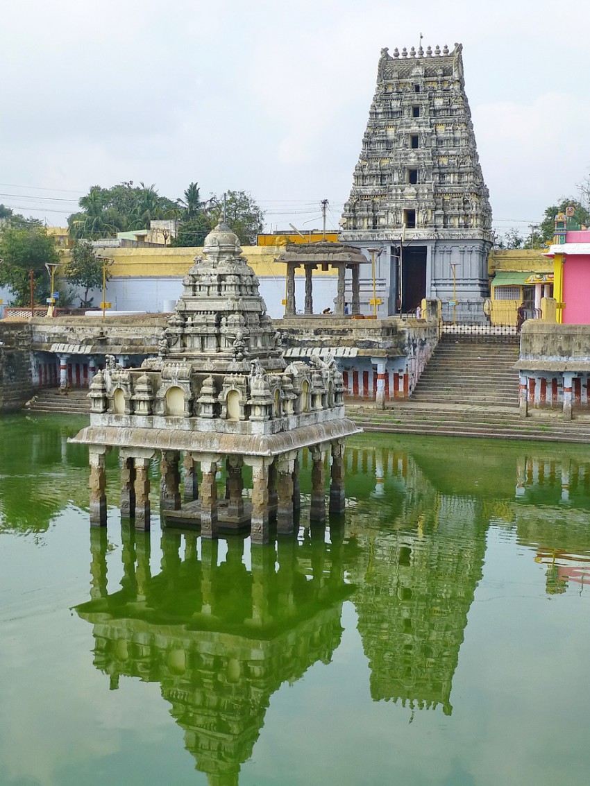 То есть это храм входит в один из пяти «храмов-элементов». В святилище находится частично погруженный в воду лингам Шивы. Внешние комнаты полны резьбы.