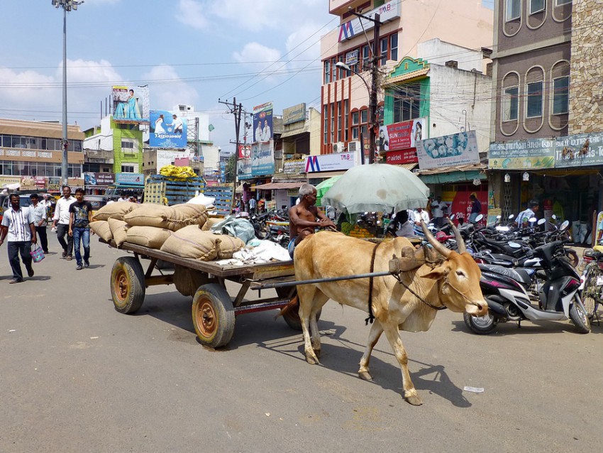 По пути в Тируваманалай по сторонам дороги видим как бесконечные поля риса чередуются с огромными плантациями сахарного тростника, кукурузы или тапиоки. А среди зарослей дикой акации часто виднеются покрытые тростником крыши аборигенов. Иногда однообразный пейзаж нарушается небольшими храмами Шивы и Хануман. Затем появляются манговые деревья, вообще много зелени, цветёт лантана. Местные жители пашут на быках. Они же впряжены в повозки.
