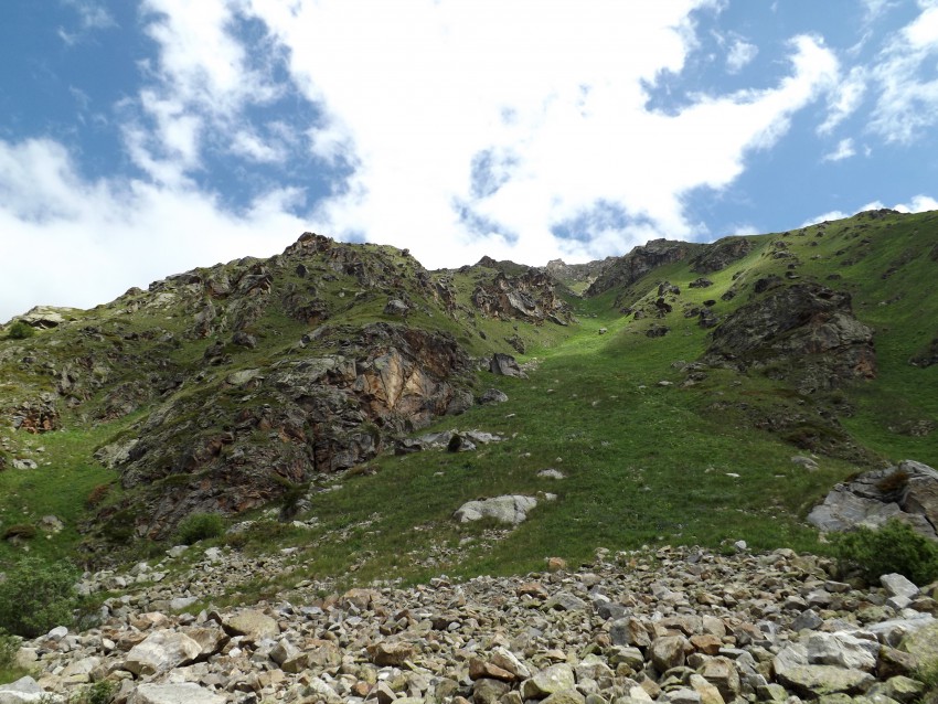 Через лагерь идёт дорога, а затем — хорошая тропа к «Зеленой гостинице». Гостиницы там в нашем понимании нет, есть место для палаточного лагеря и домик гляциологов(это учёные, изучающие ледники), где живут и работают студенты МГУ с географического факультета. От альплагеря до «зелёной гостиницы» примерно 4,5 км. Тропа идёт по руслу реки с небольшим подъёмом.