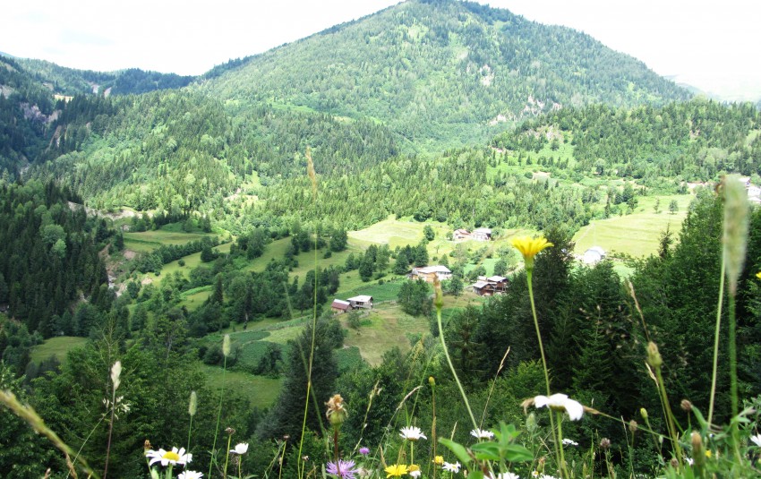 Последующий дальше достаточно большой отрезок дороги, пожалуй, можно считать самыми красивыми местами, которые мы видели в Грузии. Долины, на которых живописно разбросаны отдельные усадьбы, гуляющие буренки, хвойные леса, цветущие поля, бурлящие внизу реки.