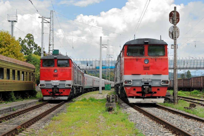 Осмотрев все что можно в этом интереснейшем месте, где сосредоточено самое большое количество раритетов на юге, мы двинулись дальше на станцию Сухум. По пути нам попался тепловоз ДМ62 с товарняком, двигающийся в сторону Псоу.
