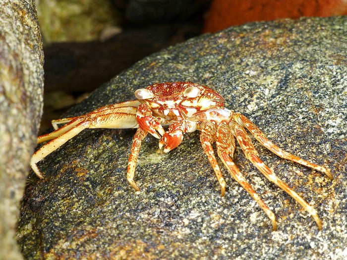 На мокрых и скользких камнях быстро бегает великое множество различных морских крабов