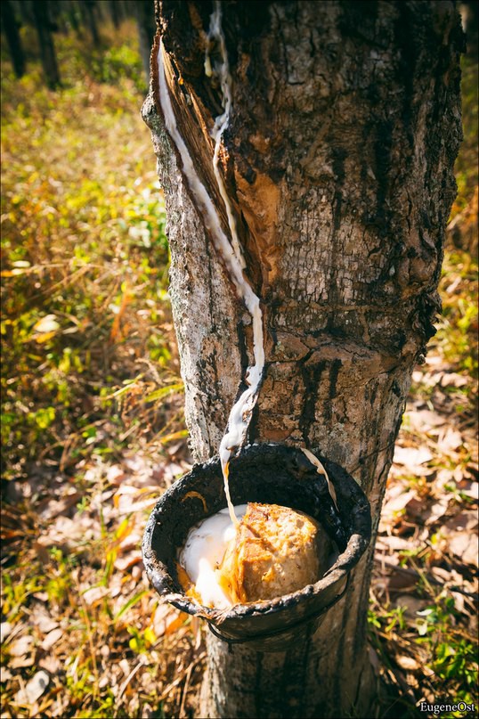 30. Затем заглянули на плантацию Гевеи чтобы заснять полные чашки наполненные каучуком. Более поздний урожай в некоторых чашках уже отвердел и плавал поверх свежего млечного сока