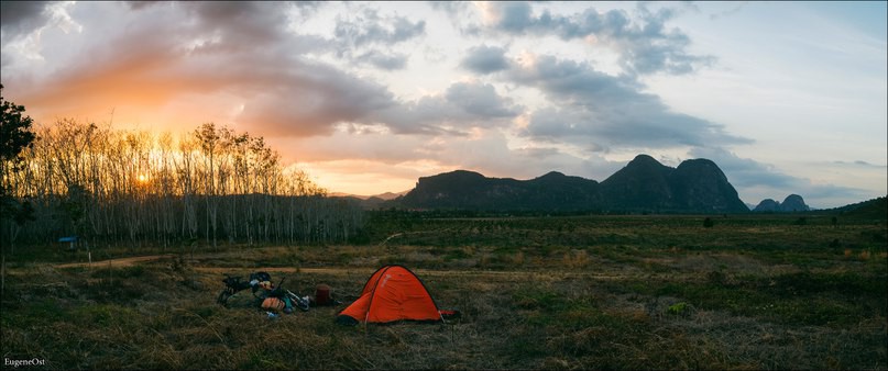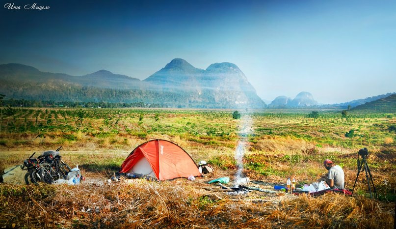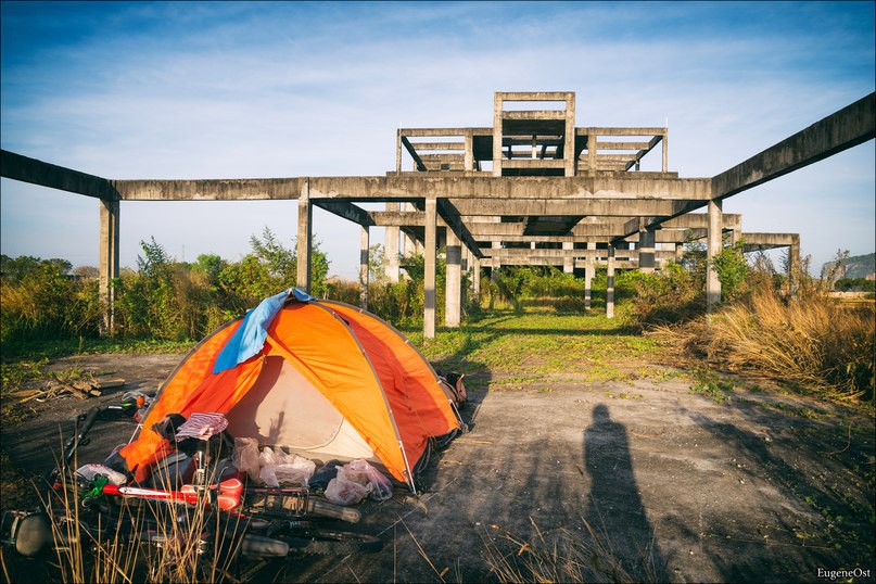 С дороги увидели большой недострой и решили остановиться там. Нас заметил какой-то местный козопас и раз то проходил пешком то на мопеде проезжал мимо и высматривал нас и что-то бухтел, но в конечном итоге он от нас отстал и мы поставили палатку на бетонной площадке и развели костёр. Ужинали, под взлетающие и садящиеся самолёты. На вечернем совете было решено возвращаться в Тай, так как ситуация складывалась так, что нам возможно в ближайший месяц — полтора придётся возвращаться в Россию и мы решили что будем двигаться обратно в сторону Вьетнама.