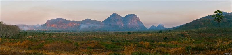 32. До рассвет встал чтобы заснять ранний пейзаж. Из посёлка поднимались струйки дыма и медленно рассеиваясь застилали вуалью стоящую позади гору