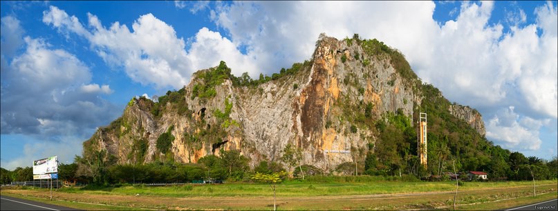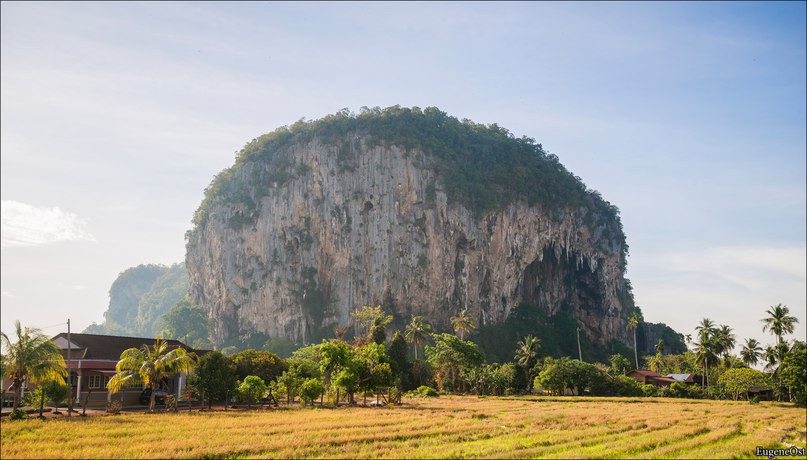 12. Ещё из далека увидели скалу и ехали к ней в надежде найти рядом тихое местечко для ночёвки. Gua Gunung Keriang — гора с пещерой внутри