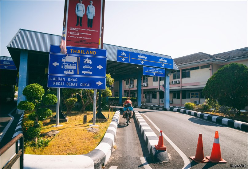 Народу на посту было очень много и мы сразу не разобрались куда вообще двигаться и кому сдаваться ))) и проехали будки. По факту можно было ехать сразу в Малайзию, но понятное дело, что без штампа от отбытии нас бы развернули обратно, так что пока я караулил велы Инга влезла в очередь и мы вскоре получили заветные штампы. На малайзийской стороне мы прямо на велосипедах подъехали к будке, где нам отсканили указательные пальцы и вклеили наклейку и вот мы в Малайзии.