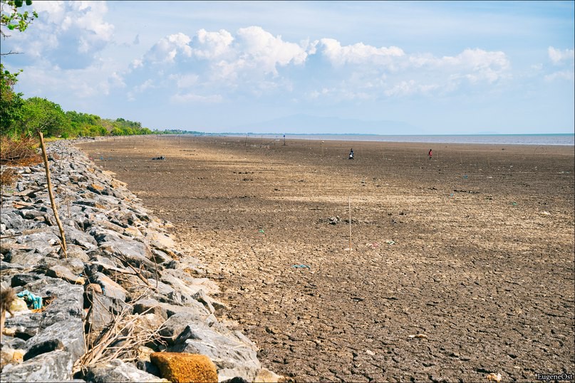 11. Съехали с основной трассы, вдоль канала приехали к морю. И вот он Малаккский залив… Ох не такого мы ожидали — вместо ожидаемого чистого пляжа и голубых волн перед нами предстал грязный илистый берег после отлива. Вдали по берегу бродили 2 мальчика и выуживали из ила морских обитателей.