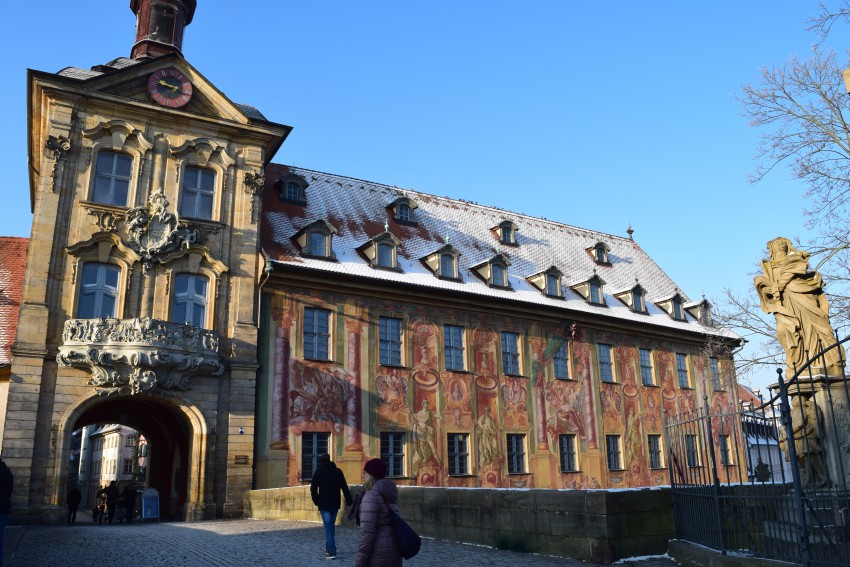 В любом старинном городе Европы есть ратуша, но в Бамберге она стоит на острове… Когда-то епископ запретил свободолюбивым горожанам строить ратушу на своей земле. И хитроумные жители вбили сваи в дно реки и построили сначала небольшой домик, а затем пристроили к нему удивительной красоты здание, расписанное фресками.