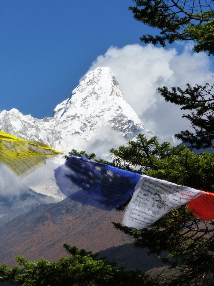 Множество молитвенных буддийских флажков — непременные атрибут горного пейзажа.