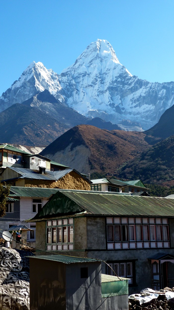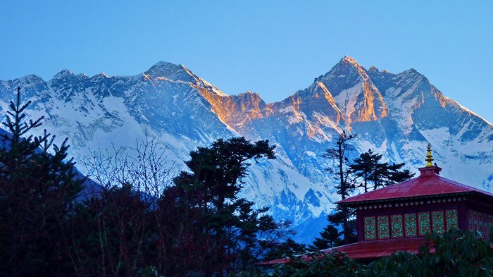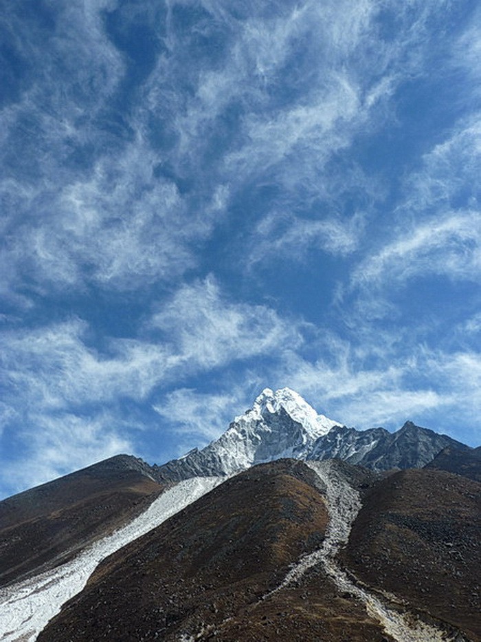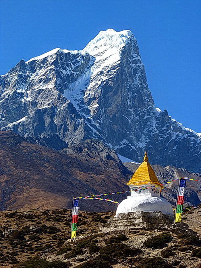 За ступой возвышается вершина, расположенная на соседним гребне — пик Тобуче (6367 м).